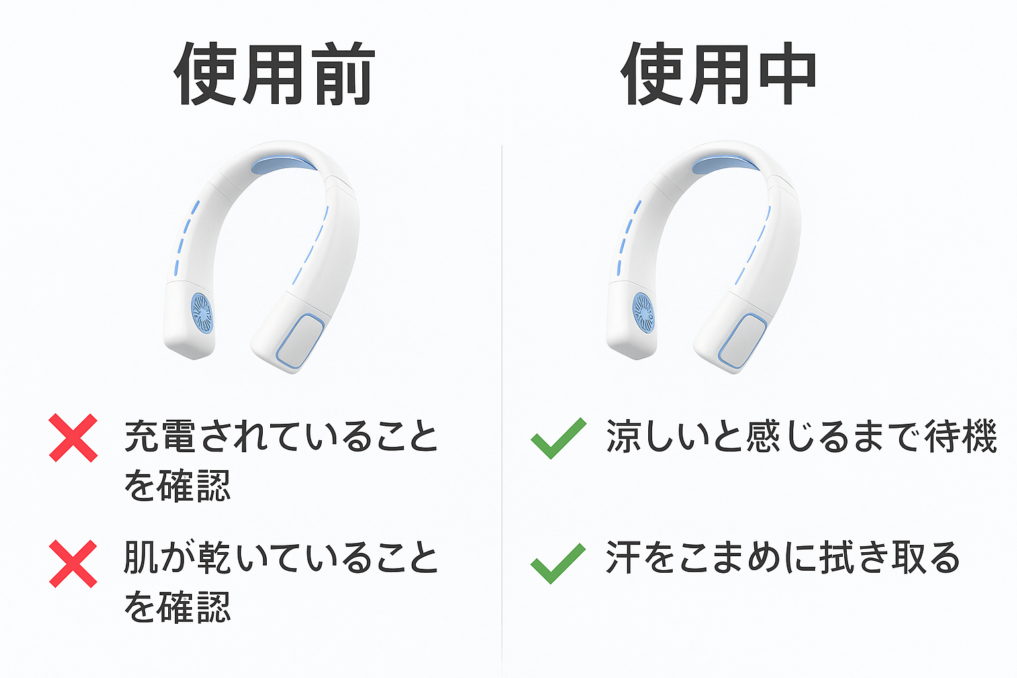 - 首元を汗で濡らさないように注意。汗で濡れた状態では冷却効率が低下し、プレートが皮膚に密着しにくくなります。使用前にはタオルなどで汗を拭き取り、乾いた状態で装着することが望ましいです。